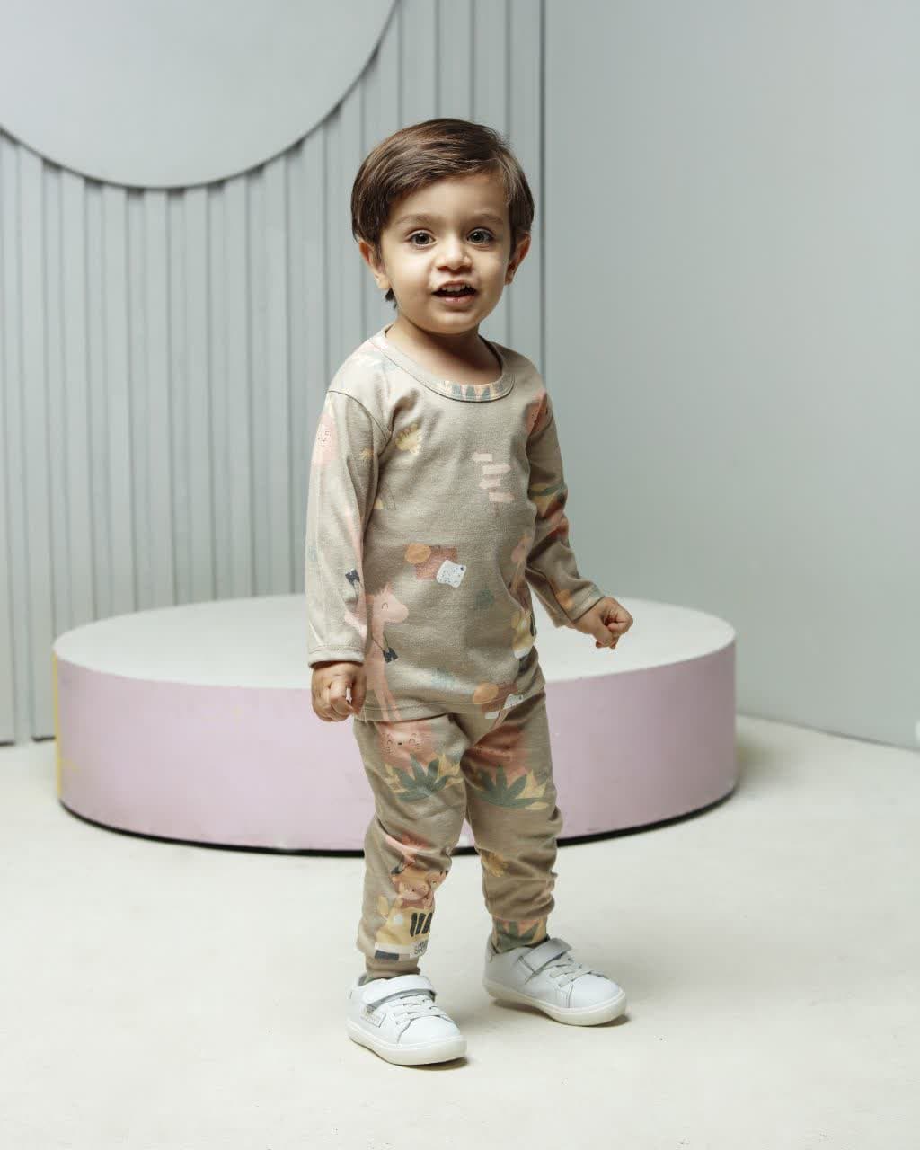 ناموجود ست راحتی بچگانه نخ پنبه سایز4 طرح حیوانات زمینه خاکی