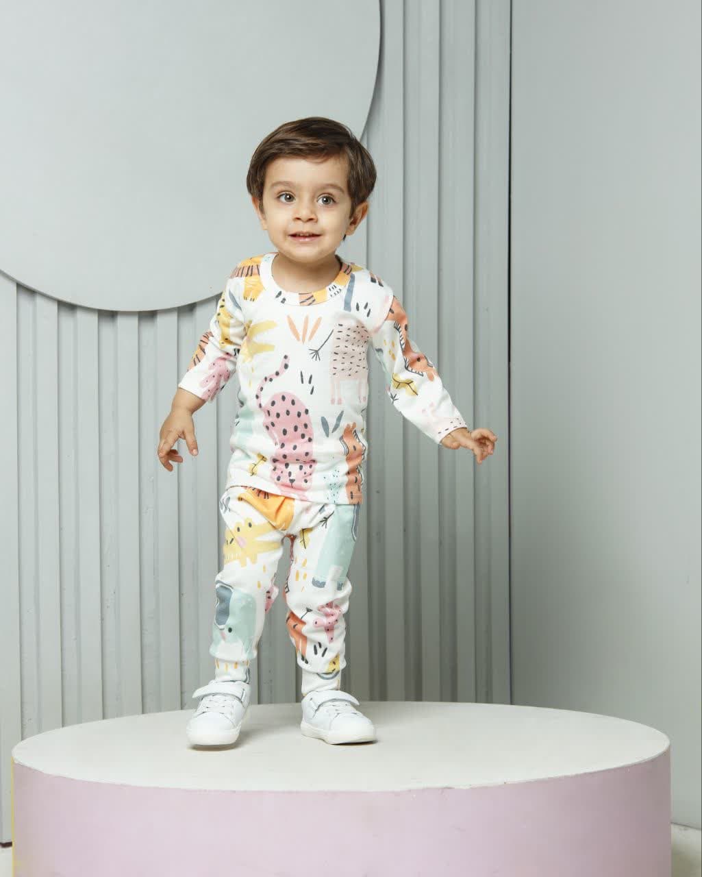 ست راحتی بچگانه نخ پنبه سایز5 طرح حیوانات زمینه سفید